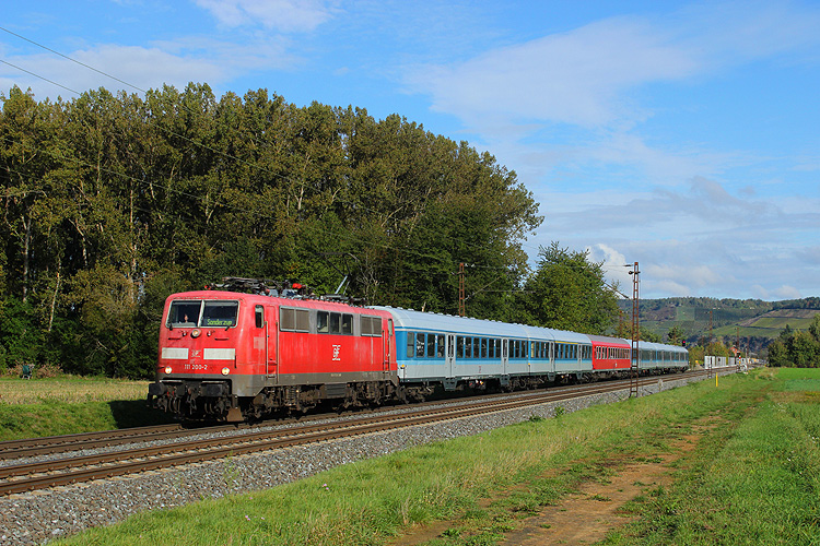 Auf der Rückfahrt wurde erneut im Maintal übernachtet. Am 05.10.2024 war GFF 111 200 mit einem Sonderzug nach Nürnberg unterwegs, aufgenommen bei Retzbach. |