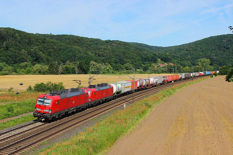 Im Sommerurlaub 2020 fuhr ich wieder für ein paar Tage ins Maintal. Am Sonntagnachmittag, 12.07.2020 konnte ich an der Schleuse Harrbach das EBS-Doppel 140 789+772 mit dem Holzzug DGS 56114 Göttingen - Ingolstadt aufnehmen. |
