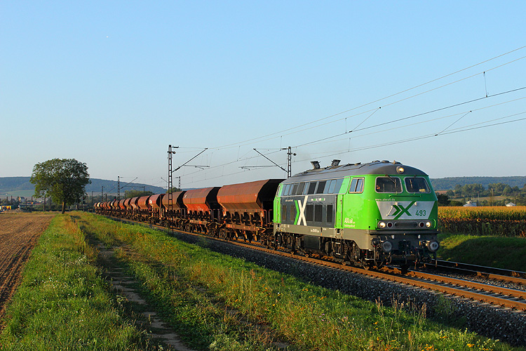Am Mittwochmorgen 28.08.2024 war Aixrail 218 493 mit einem Schotterzug in Richtung Gemünden unterwegs. |