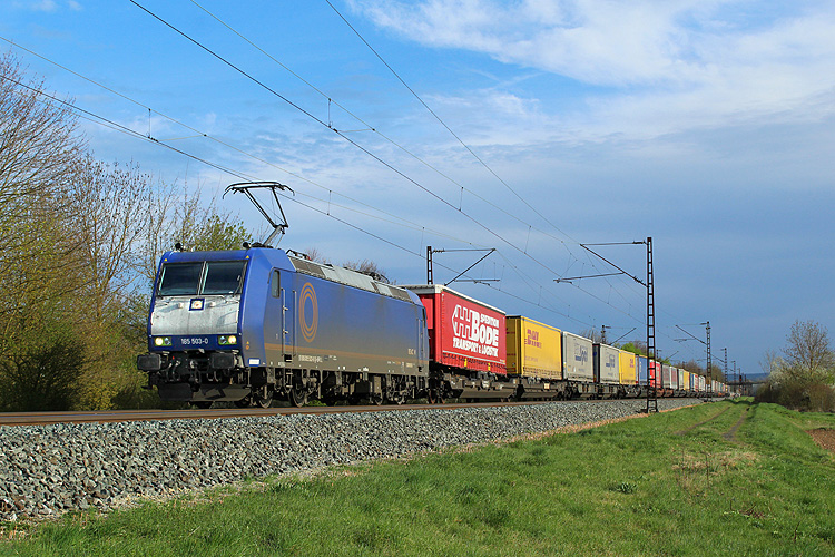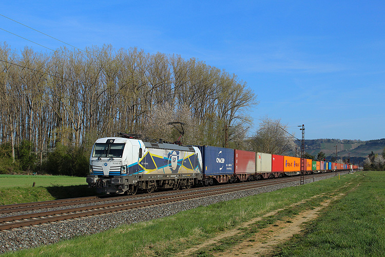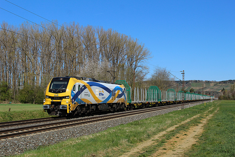 Anfang April 2025 machte ich auf der Anreise nach Basel einen zweitägigen Fotostop im Maintal. Am Samstag 05.04.2025 ging es dabei zunächst nach Thüngersheim. Lokomotion 185 665 kam mit dem Paneuropa/ Terratrans-KLV Bremen - Verona. |