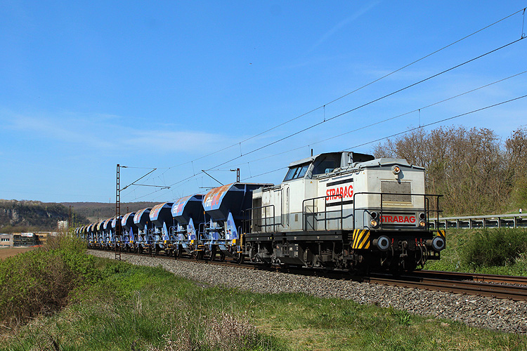 Dann ging es wieder nach Karlstadt - Strabag 203 012 mit Schotterzug in Richtung Würzburg. |