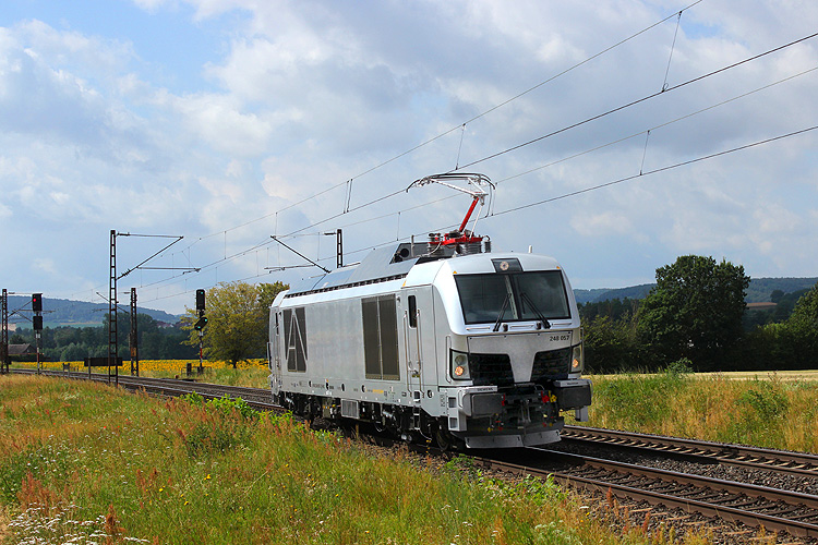Solo fahrend folgte die nagelneue RHC 248 057 auf Auslieferungsfahrt. |