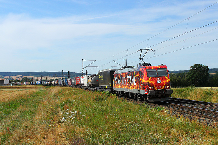 185 077 war mit einem KLV in Richtung Gemünden unterwegs. |