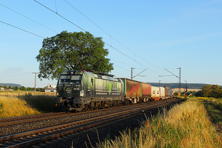 Im schönsten Abendlicht ging es noch mal kurz zurück nach Retzbach, TXL 193 582 kam mit dem KLV DGS 43100 Verona - Wanne Eickel. |
