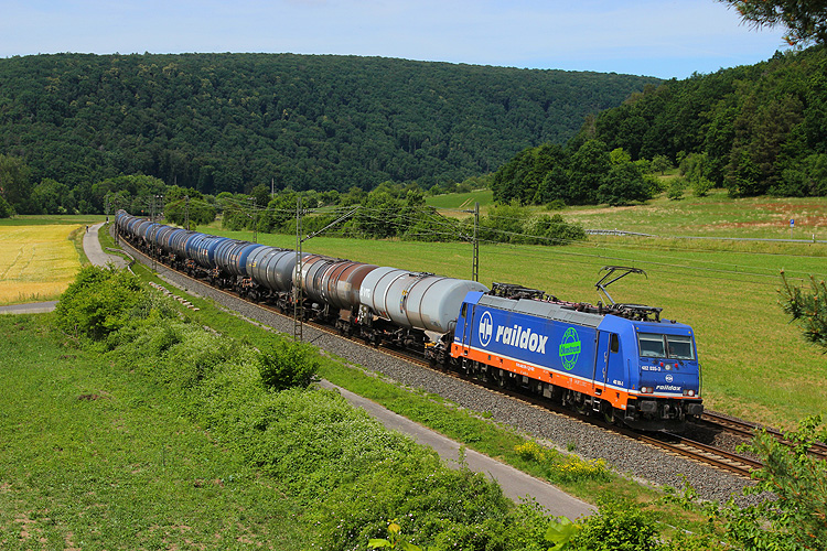 Raildox 482 035 war mit einem Kesselzug in Richtung Würzburg unterwegs. |