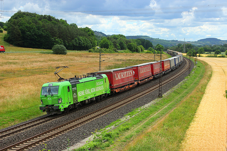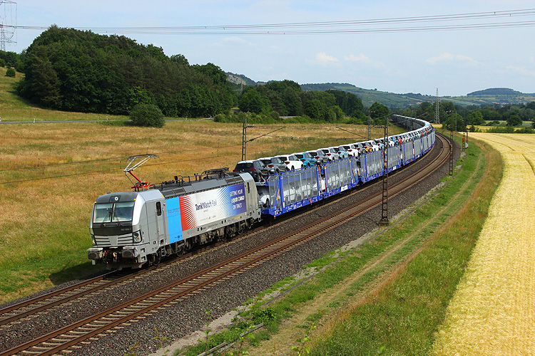 Frachtbahn 193 230 hatte einen H-Wagenzug in Richtung Gemünden am Haken. |