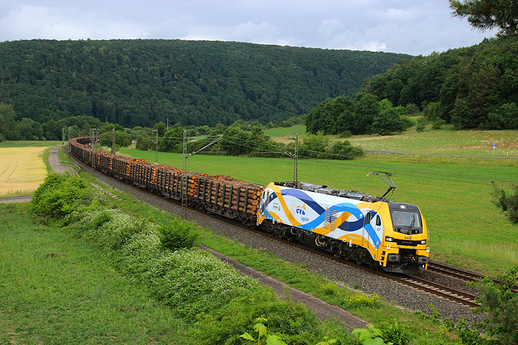 Am Pfingstsonntag 05.06.2022 fuhr unter anderem SETG 193 218 mit einem leeren Holzzug in Richtung Gemünden. |
