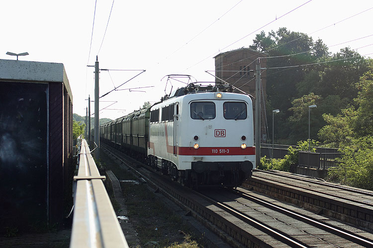 Da eine der Press-145 zur Untersuchung im Werk Dessau weilte, war am 19.08.2008 deren Ersatzlok 110 511 im Holzzugverkehr im Einsatz. Sie fährt gerade an der Rückseite des neuen Bahnsteig 2 des Gardelegener Bahnhofs vorbei, der nur wochentags von einer einzigen Regionalbahn genutzt wird. |