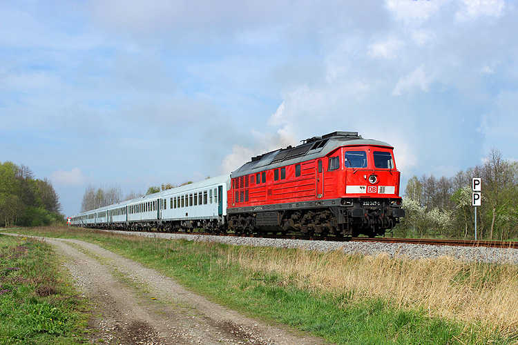 233 347 hat den Bahnübergang der Verbindungsstraße Kloster Neuendorf - Zienau passiert, 12.04.2014. Sie brachte Begleitwagen zum GÜZ, da wegen des bevorstehenden Osterfestes viele Einheiten nach Hause fahren wollten. |