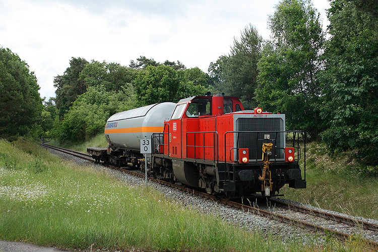 262 007 schiebt an gleicher Stelle einen Flachwagen zum GÜZ und nahm auch gleich noch den leeren Gaskesselwagen mit, den sie vorher in Gardelegen abgeholt hatte, 21.06.2011. |
