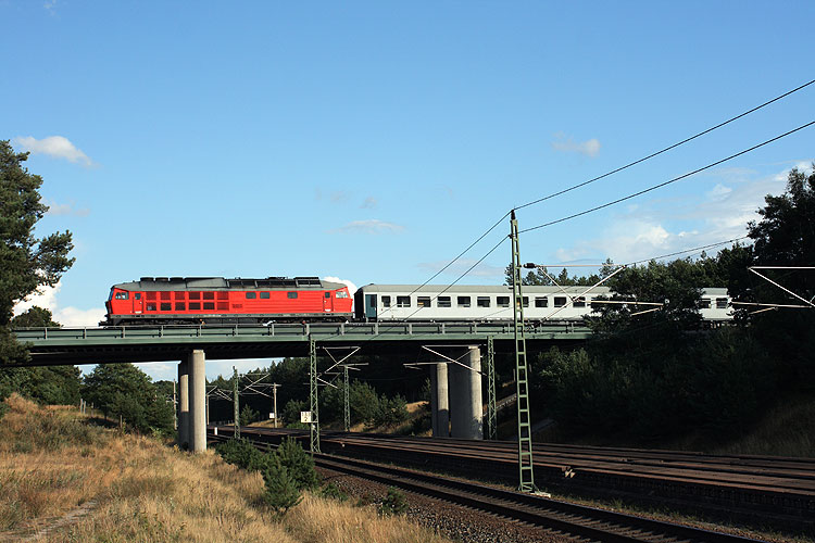 Mit einem Militärzug aus Letzlingen Ost kommend ist hier 233 452 auf dem Überführungsbauwerk über die Hauptbahn bei Kloster Neuendorf zu sehen, 29.08.2009. Vorn im Zug liefen zwei der speziell für den Militärverkehr gebauten Reisezugwagen. |