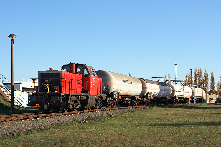 Die hauptsächlich der Bedienung des Gardelegener Gaslagers dienenden Übergaben wurden vom Herbst 2008 bis Ende 2009 von modernisierten West- V 100 erbracht, die bei der Güter-DB als Baureihe 262 eingereiht waren. 262 007 ist hier gerade mit dem Tauschen der Kesselwagen beim Gardelegener Gashändler beschäftigt, 30.10.2009. |