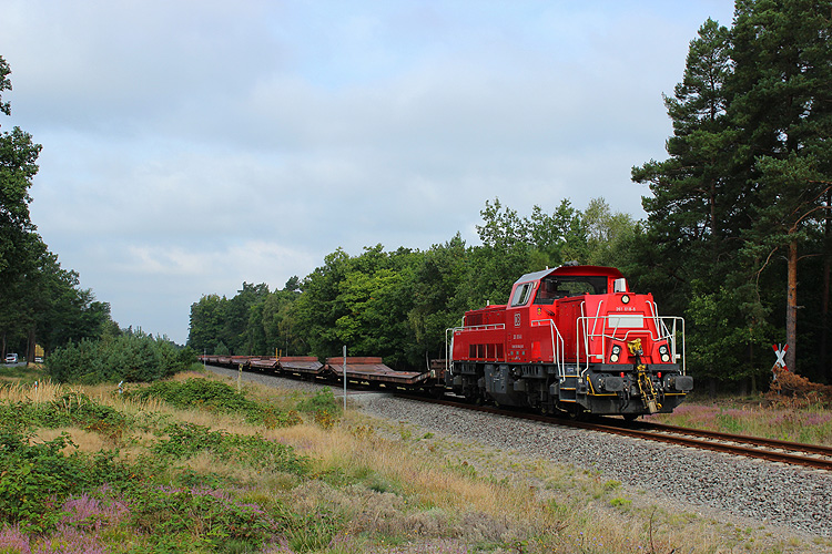 Das Gleis verläuft noch etwa einen Kilometer parallel zur B 71 und erreicht dann das militärische Sperrgebiet. Hier ist 261 018 mit einem Leerzug in Richtung GÜZ unterwegs, 12.09.2014. |