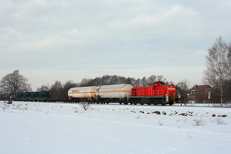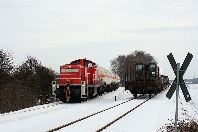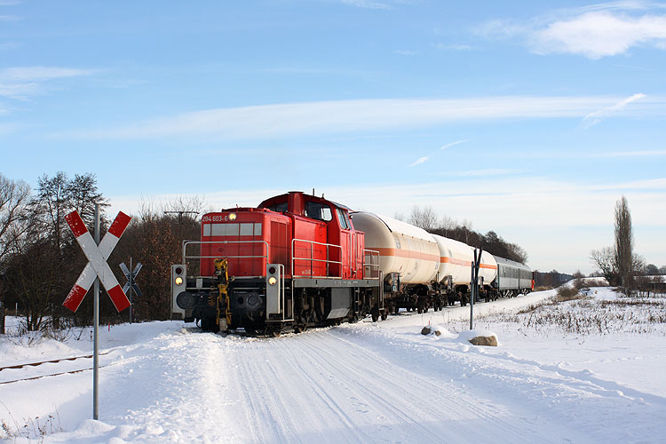 294 603 schob am 10.12.2010 ihre Übergabe zum Gefechtsübungszentrum, weil der Rangierlokführer zu bequem zum Umsetzen der Lok im Bahnhof Gardelegen war. Da am Bahnübergang der Straße Kloster Neuendorf - Zienau die Straßen-Schneepflüge die Gleise mit Schnee zugedrückt hatten, mußte mit den geschobenen Wagen dort sehr vorsichtig gefahren werden, um nicht zu entgleisen. So dauerte die Prozedur mit mehrmaligem vor- und zurück inklusive Batteriewechsel für die Lok-Fernbedienung eine Viertelstunde. |