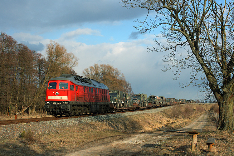 Auch am 05.03.2010 rollten wieder Militärzüge an Kloster Neuendorf vorbei, wie dieser mit 232 524 vom GÜZ zurückkommende. |
