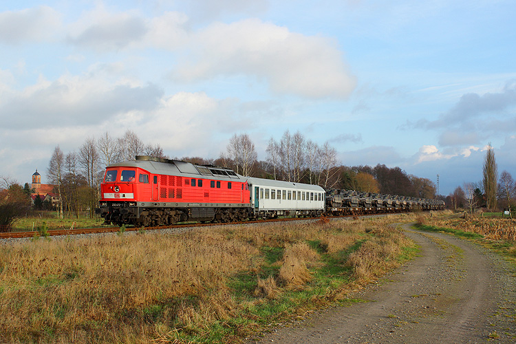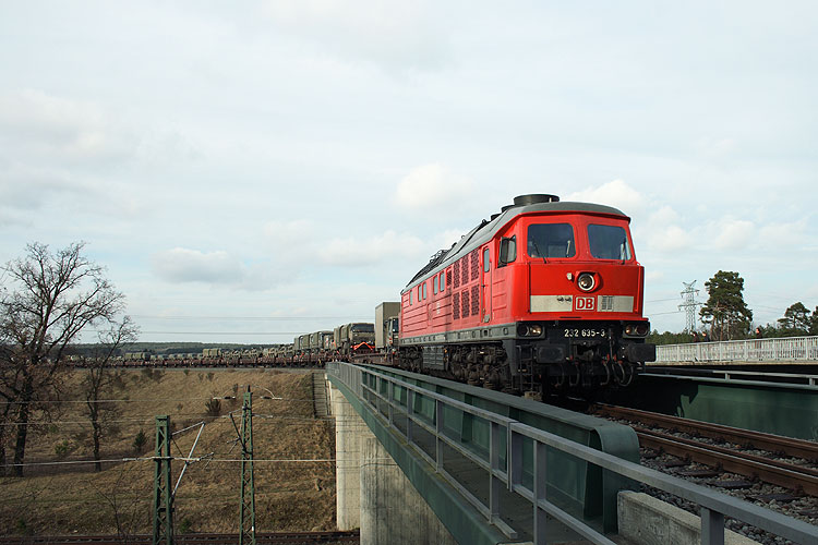 Mit einem kurzen Militärzug ist 232 675 hinter Gardelegen zum GÜZ unterwegs und wird gleich unter der B 71 hindurchrollen, 17.04.2010. |