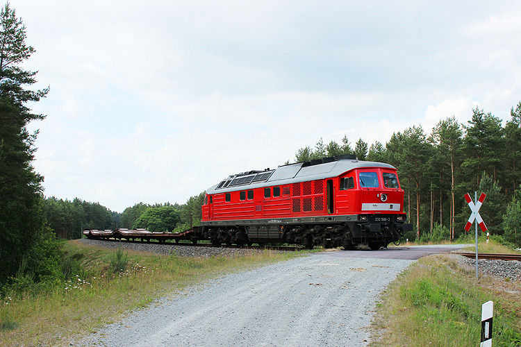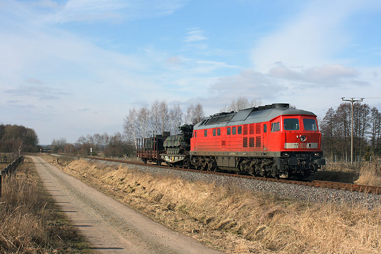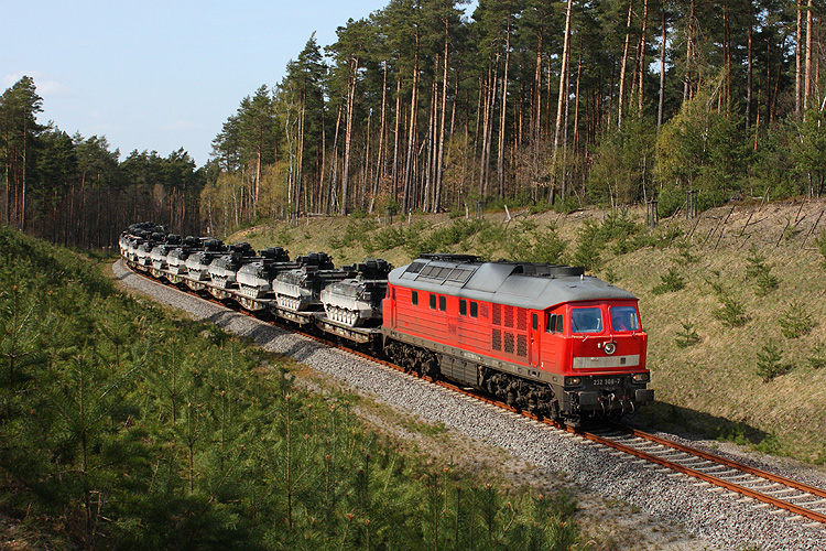 Auf Höhe des ehemaligen Haltepunktes Forst schwenkt die Militärbahn in einer langgestreckten Kurve parallel zur B 71 in Richtung Truppenübungsplatz ein. An dieser Stelle fährt 232 308 mit einem Militärzug in Richtung GÜZ, 16.04.2010. |