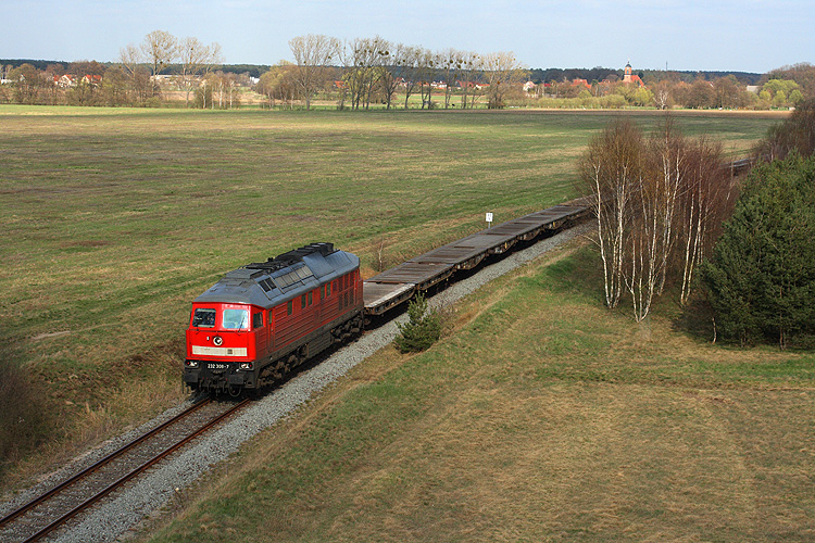 232 308 kommt mit einem Leerzug vom GÜZ zurück, aufgenommen von der Brücke der Gardelegener Ortsumgehung der B 71, 16.04.2010. |
