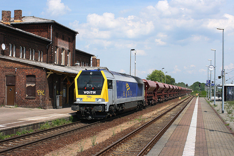 Die neue Voith-Maxima 40CC der e.g.o.o. durchfuhr am 06.06.2010 mit einem Kieszug in Richtung Westen den Bahnhof Gardelegen. |