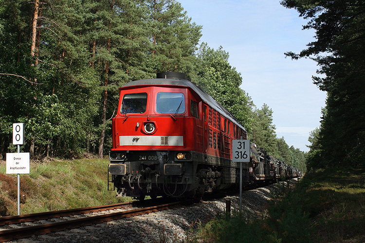Am Kilometer 31,316 beginnt die Neubaustrecke zum Truppenübungsplatz. Am 20.08.2010 war 241 008 mit einem Militärzug zum GÜZ unterwegs und wird auf der neuen Trasse direkt auf das Militärgelände gelangen. Zu DDR-Zeiten wurden die Militärfahrzeuge im Bahnhof Letzlingen Be- und Entladen, verbunden mit großer Lärmbelästigung für die Anwohner und häufigen Schäden an den anschließend genutzten Straßen zum Übungsplatz. |