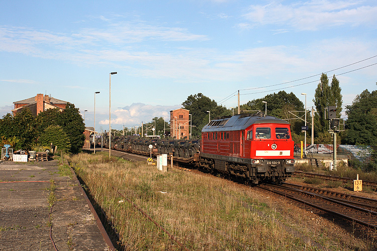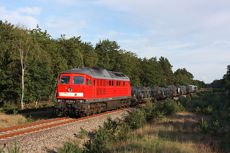 232 524 hat im GÜZ einen Militärzug abgeholt und rollt entlang der B 71 in Richtung Gardelegen, 03.09.2010. |