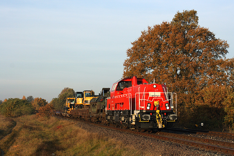 Im Herbst 2010 übernahmen die von der DB angemieteten nagelneuen Northrail-Gravitas die Beförderung des dreimal wöchentlich verkehrenden "Nahgüters" Stendal - Gardelegen - Stendal. Zumeist muß dieser nur den Gardelegener Gashändler anfahren, bei Bedarf muß aber auch das Gefechtsübungszentrum bedient werden. So hatte am 29.10.2010 die neue Stammlok 260 506 Bautechnik zum GÜZ zu bringen und passiert den Abzweig des Anschlußgleises zum Gashändler in Gardelegen. |