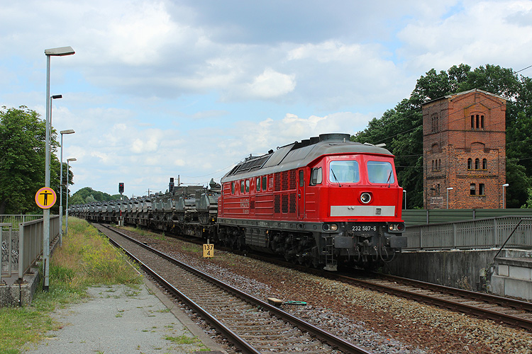 Mit einem niederländischen Militärzug vom GÜZ kommend rollt 232 587 in das Gleis 2 des Bahnhof Gardelegen ein, 10.06.2016. |