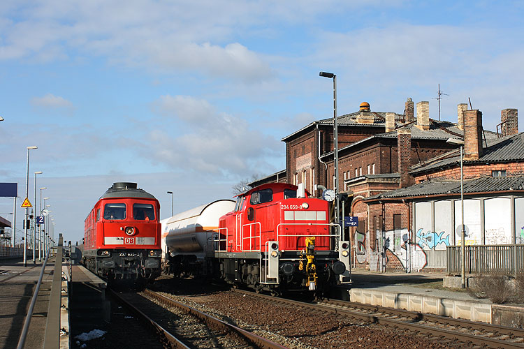 294 659 hat die Gaskesselwagen beim Gardelegener Gashändler getauscht und macht sich auf die Rückfahrt nach Stendal, 232 635 wird sich sogleich auf den Weg zum GÜZ machen, um einen Militärzug abzuholen, 05.03.2010. |