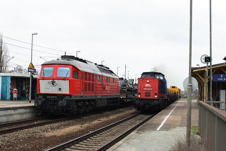 Während 232 241 noch für die Weiterfahrt zum GÜZ auf ihren aus Magdeburg anreisenden Lokführer warten muß, brummt WFL 202 264 mit einem Bauzug vorbei, 16.04.2010. |