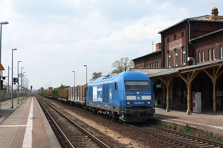 Der Press-Herkules 253 014 war am 01.05.2010 mit einem Holzzug nach Niedergörne in Gardelegen zu sehen. |
