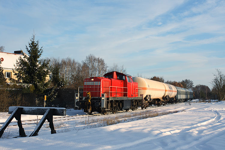 294 603 hatte am 10.12.2010 neben den üblichen Gaskesselwagen für Gardelegen auch zwei Militär-Reisezugwagen dabei, die sie zum Gefechtsübungszentrum zu bringen hatte. Da der Rangierlokführer zu bequem zum Umsetzen der Zuglok im Bahnhof Gardelegen war, ging die Fuhre geschoben auf die Reise in die Letzlinger Heide. Der Zug befindet sich hier im Bahnhofsteil der ehemaligen altmärkischen Kleinbahnen, der sich einst Gardelegen Anschluß nannte. |