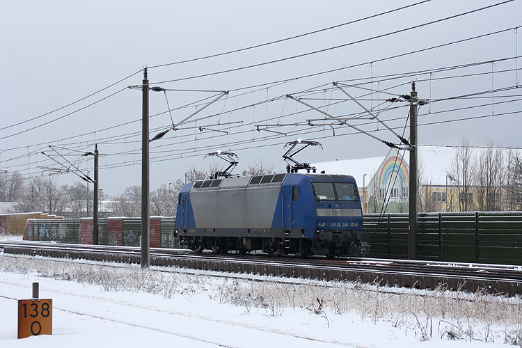 Große Probleme hatte am Morgen des Heiligen Abends 2010 in Gardelegen auch die für die Crossrail fahrende 145-CL 204. Nach dem stundenlangem Eisregen am Tag und in der Nacht zuvor hatte sich auch um die Oberleitung eine zentimeterdicke Eisschicht gebildet, die den Kontakt der Stromabnehmer der Elloks behinderte. In der Nacht mußte man schon mehrere ICE mit Dieselloks abschleppen, nun war der leere Crossrail Fiatzug nach einem Halt an der Überleitstelle nicht mehr in Gang zu bringen. So mußte sich die Zuglok selbst die Fahrleitung unter großem Funkengeknister freiputzen, nach zwei Stunden harter Arbeit konnte es dann endlich weitergehen. |
