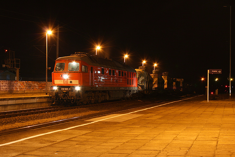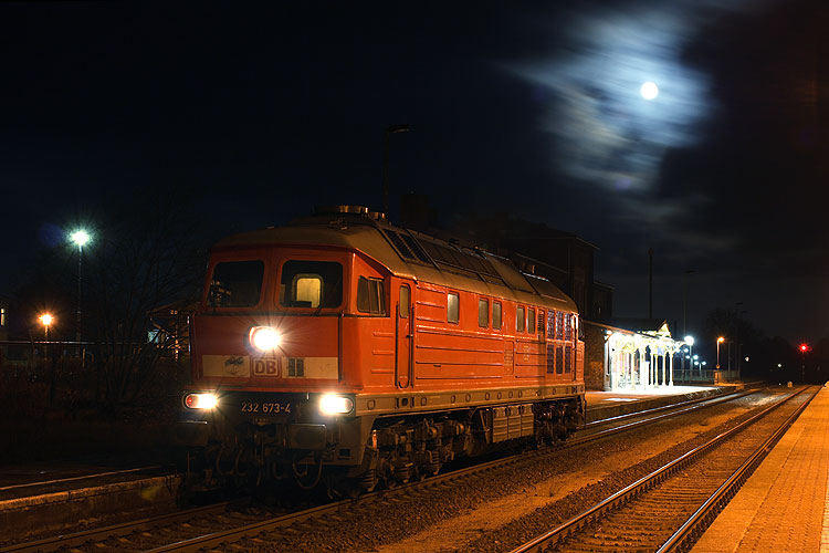 Die Mondfinsternis am 10.12.2011 war leider gerade zu Ende, als ich im Bahnhof Gardelegen dieses Bild von der umsetzenden 232 673 machen konnte. Die Lok hatte einen Militärzug des österreichischen Bundesheeres aus dem Gefechtsübungszentrum geholt und beförderte diesen anschließend in Richtung Stendal weiter. |