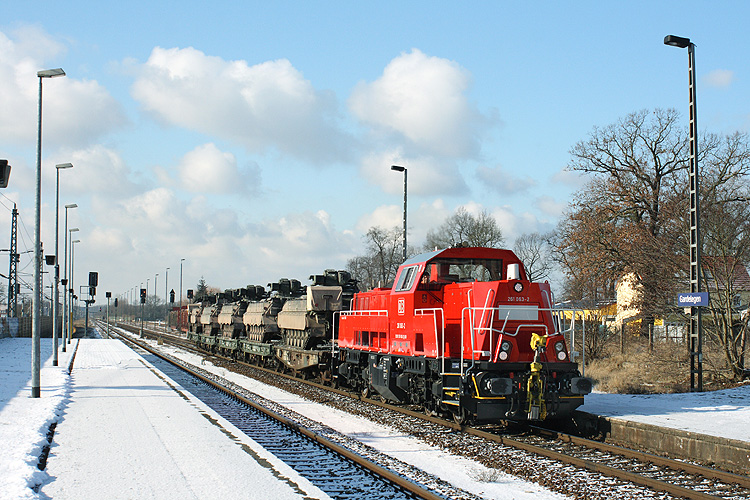 Kaum das das neue Jahr angefangen hatte, startete auch das GÜZ in die neue Manöversaison. Nachdem am 18.01.2013 die erste Übung des Jahres zuende war, holte 232 524 die Militärtechnik ab, aufgenommen beim Kopfmachen am späten Nachmittag vor der Weiterfahrt in Richtung Stendal. |