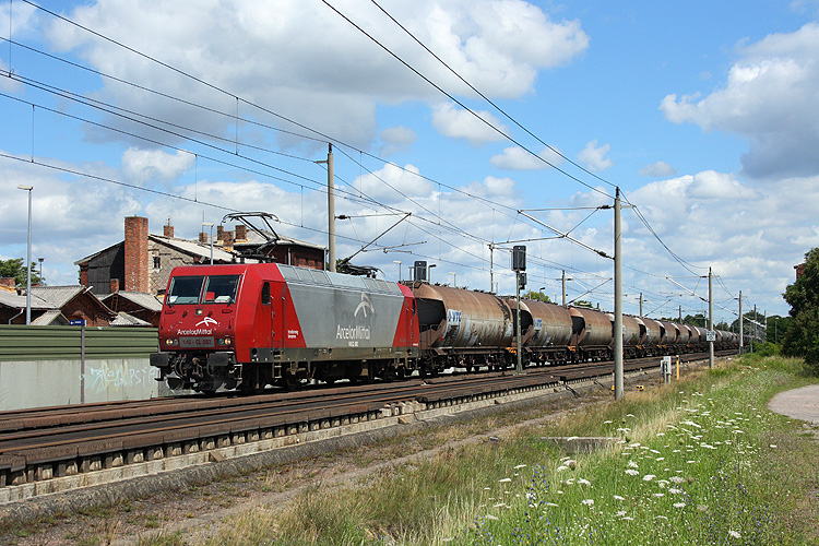 185 583 der HVLE mit einem Kesselzug in Richtung Westen, 11.06.2010. |