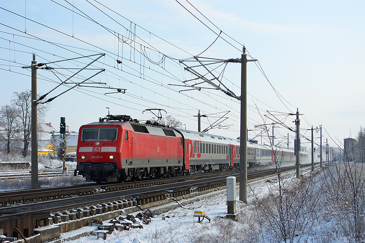 15.03.2013 - der Winter will in diesem Jahr einfach nicht weichen. So kann man aber auch mal dem morgens verkehrenden EN 452 Moskau - Paris im Schnee hier aufnehmen, 120 135 eilt mit diesem mit nur 30 Minuten Verspätung westwärts. |