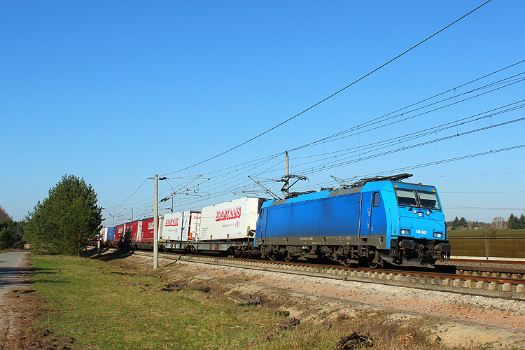 Am 06.04.2020 wurde LTE 186 942 mit dem Erontrans-KLV DGS 41351 Rotterdam - Poznan über die HGV umgeleitet. |