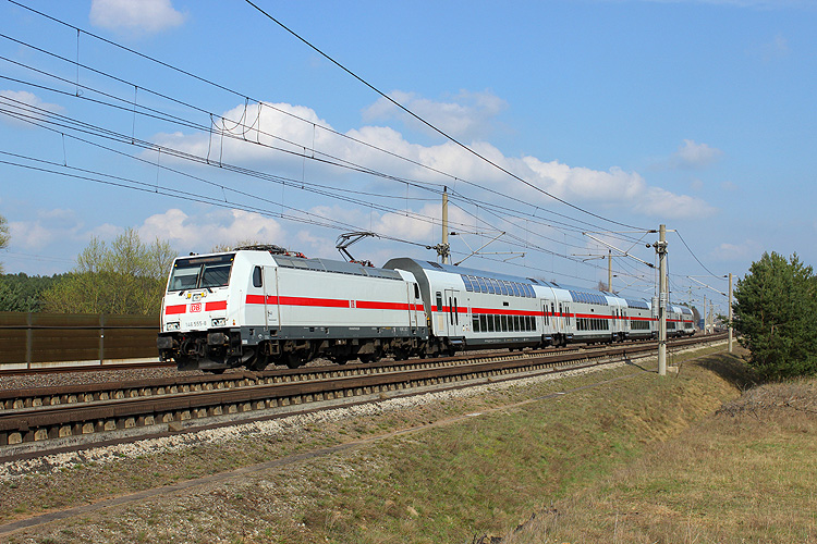 Mehrere Wochen fuhren die Doppelstock-IC der Linie 55 Dresden - Köln wegen Bauarbeiten bei Braunschweig über Stendal - Wolfsburg. Am 02.04.2017 war wegen einer baubedingten Sperrung des Magdeburger Hauptbahnhofes auch die Linie 56 betroffen, 146 555 mit dem IC 2036 Leipzig - Norddeich Mole. |