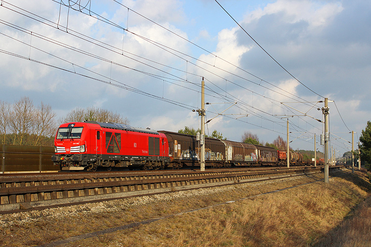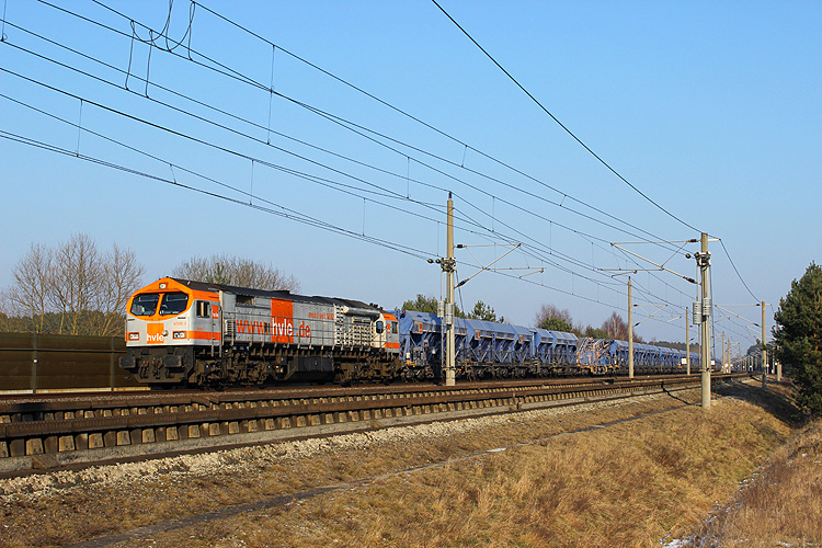 Am 02.03.2018 kam HVLE 250 010 mit einem leeren Kieszug nach Flechtingen durch Jävenitz gefahren. |