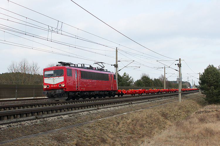 Mit nagelneuen Wagen für den Trailer-Transport fuhr am 05.03.2018 155 183 von Maik Ampft Eisenbahn Dienstleistungen (MAED) westwärts. |