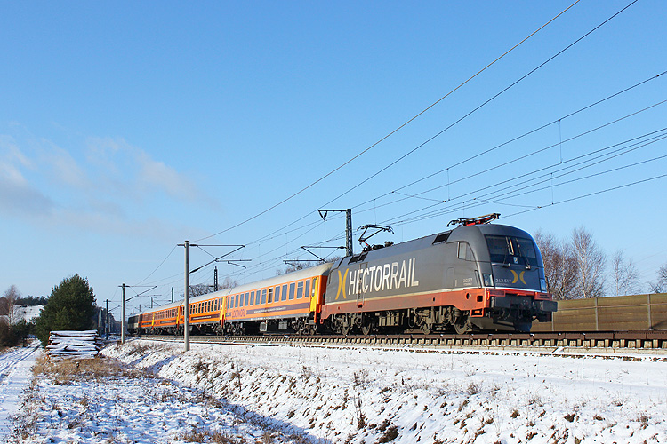 Endlich fährt auch mal ein privater Fernzug über meine Hausstrecke, der Locomore Berlin - Stuttgart und zurück. Bespannt ist er zumeist mit Hectorrail 242.517 "Fitzgerald", hier am 14.01.2017 mit dem LOC 1818 Stuttgart - Berlin. |