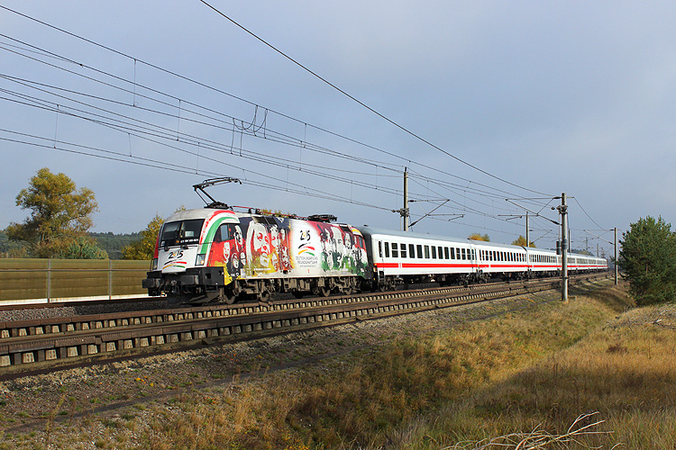Ab dem zweiten Halbjahr 2015 wurde der IC 1991 Berlin - Frankfurt/Main Sonntags mit angemieteten 182 von MRCE gefahren. Am 25.10.2015 war 182 521 "2015 Deutsch-Ungarisches Freundschaftsjahr" Zuglok, während die schwarze 182 507 am Zugschluß schob. |