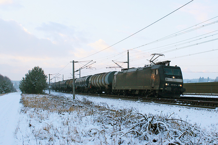 Eine Woche richtiges Winterwetter wollten im Januar 2016 genutzt werden, 185 557 der CTL fuhr am 20.01.2016 mit einem Kesselzug ostwärts. |