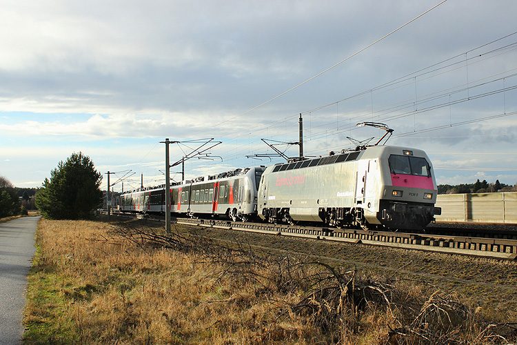 Der Eurosprinter 127 001, alias PCW 8, überführte am 08.02.2016 einen Triebzug in Richtung Osten. |
