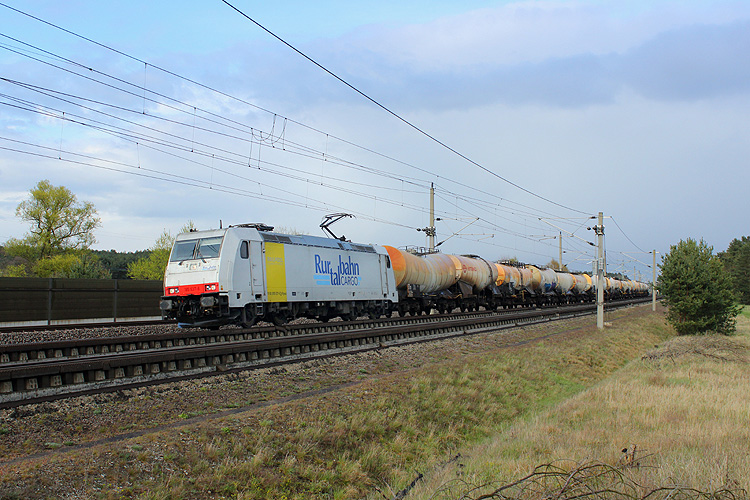 Der leere Kreideschlammzug Schwedt - Emden der Rurtalbahn kam am 26.04.2016 über die Schnellfahrstrecke gefahren, bespannt mit 185 637. |