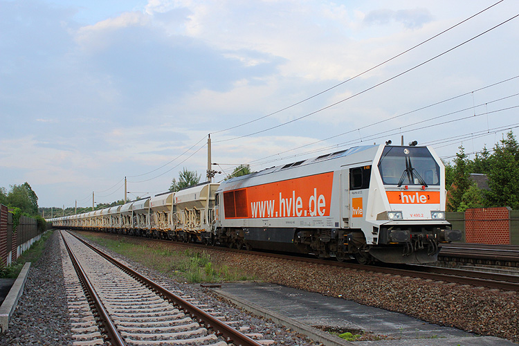 Am Abend des 02.06.2016 fuhr V 490.2 der HVLE mit einem Kieszug westwärts. |