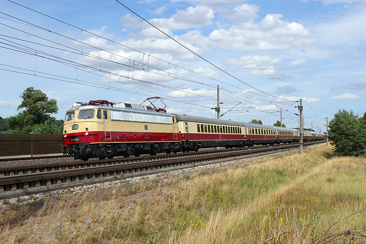 Endlich wieder eine passende Lok für den "Rheingold" - E 10 1309 der AKE mit dem DPE 51 von Görlitz nach Koblenz am 10.07.2016. |