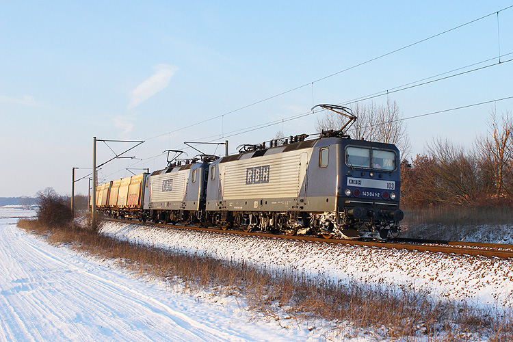 Das 143-Doppel 103 + 117 der RBH rollt mit dem Hackschnitzel-Containerzug Wismar - Mannheim in Stendal ein, 25.01.2014. |