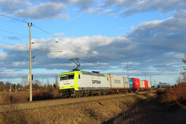 Spät dran war am 09.02.2014 der Captrain-Containerzug nach Hamburg, 145 095 fährt im schönsten Abendlicht in Richtung Salzwedel aus. |