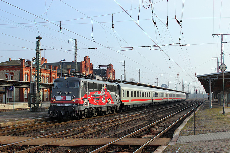Diese Lok hatte ich mir für diesen Zug gewünscht, am 28.02.2014 ging mein Wunsch in Erfüllung - die Werbelok 115 509 "80 Jahre Auto im Zug" durfte den IC 2238 von Leipzig nach Rostock bringen und kam natürlich am Nachmittag auch wieder mit der Rückleistung IC 2239 retour. |